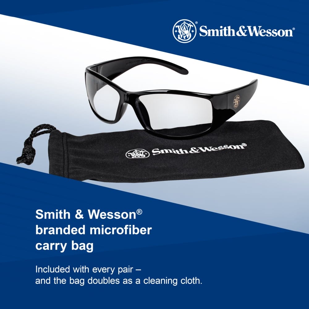 • Every pair of safety glasses comes with a Smith & Wesson® branded microfiber carry bag that doubles as a cleaning cloth